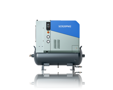 PM2 series - The very latest energy saving screw compressor, featuring a permanent magnet IE4 oil cooled motor with 1:1 direct drive. Quiet operation with a wide operating speed range, mounted on a 130L air receiver, Also Available with refrigerant dryer.